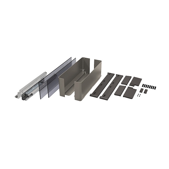 Боковины правая и левая, крышки декоративные для направляющих правая и левая, направляющие правая и левая, заглушки передние правая и левая, заглушки задние правая и левая, крепеж. Передняя и задняя стенка из стекла. ТРЕБУЕТСЯ ИЗГОТОВЛЕНИЕ ДНА ПОЛКИ.